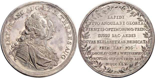 AR medaile na založení kláštera sv.Kateřiny v Linci 1745 - dvojportrét, opis / 9-řádkový nápis, Nesign. (Donner), 49mm, 34.944g, H.2883, vada mat., nep.rysky