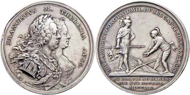Wiedeman - AR medaile na prus.kapitalaci 21.XI.1759 - dvojportrét zprava, opis / odevzdání zbraní vítězům, písmo, Sign., měď 46mm, 34.264g, M.1869, dr.rys.,pat.