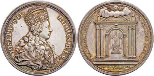 Oexlein - AR medaile na císařskou korunovaci 3.4.1764 - korunované poprsí zprava, opis / chrám se 6 sloupy, písmo, Ag 45mm, 29.209g, Nov.C.5a, H.3126, patina R!