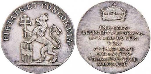 Menší jeton na korunovaci v Praze 6.9.1791 - lev se znakem a křížem, opis / koruna a 8-řádkový nápis, Ag 20mm, 2.183g, Nov.Q.4b, ČS.1433, Don.3053, patina