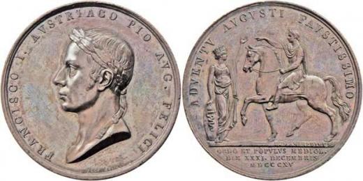 Vassallo - návrat císaře do Milána v prosinci 1815 - poprsí zleva, opis / Lombardie zdraví císaře na koni, opis a nápis, Sign., měď 43 mm, jako H.3437(Ag), pat.