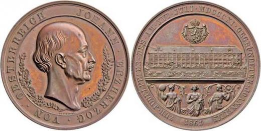 Radnitzky - AE medaile - 50 let Johannea v Grazu 1861 - hlava zprava, dubový věnec, opis / znak, budova, tři postavy a opis, Sign., 51mm, 67.851g, Haus.1600