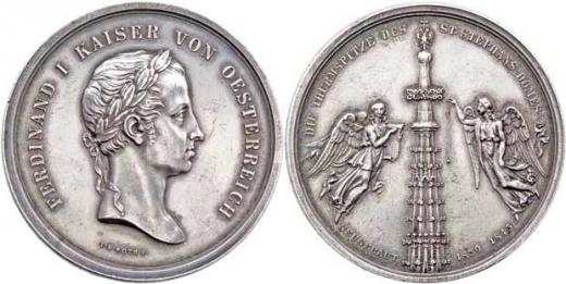 Roth - dokončení věže chrámu sv.Štěpána ve Vídni 1843 - poprsí zprava, opis/ vrchol věže mezi dvěma anděly, opis, Ag 47mm, 52.471g, M.2605, dr.hr., dr.rys., pat.