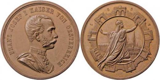 Seidan - AE medaile na otevření Ringstrasse 1857/1865 - poprsí zprava, něm.opis / Vindobona bořící hradby, nápis na hraně, Sign., 44mm, 32.554g, Haus.2235, pat.