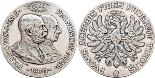 Neuberger a Prinz - 100.výročí obrany Tyrol 1909 - poprsí Františka II. a Fr.Josefa zprava, opis / znak a opis, Sign., Punc., Ag 45mm, 39.969g, nep.rysky