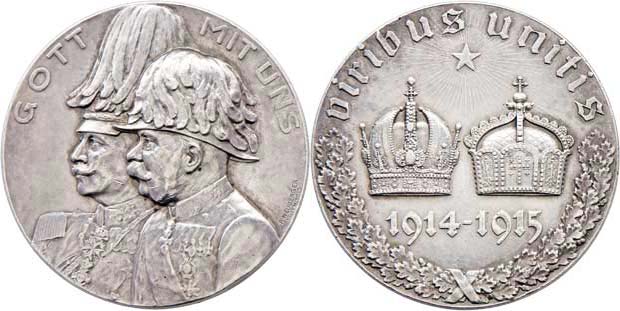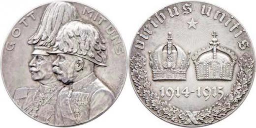 Neuberger - na spojenectví s Německem 1914/1915 - dvojportrét zleva, opis / dvě koruny, hvězda, věnec a nápis, Sign., Punc., Ag 60mm, 104.750g, hr., rysky