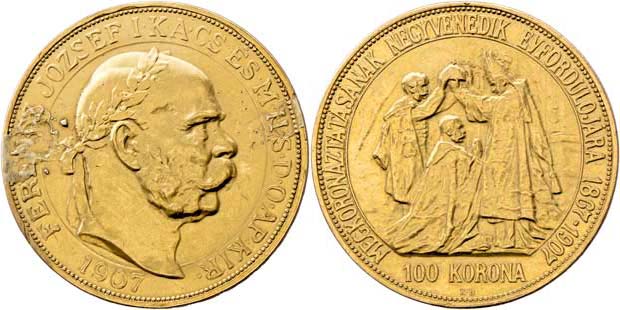 100 Koruna 1907 KB - jubilejní - původní ražba (pouze 11.000 ks), 33.782g, stopa po sponě, dr.hr., dr.rysky R!