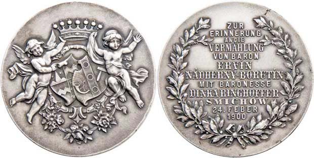 Svatební medaile 1900 - dva andělé drží korunu nad rodovými znaky a květy / 12-řádkový nápis ve věnci, Nesign., Nepunc., Ag 50mm, 51.305g, hr., dr.rysky R!