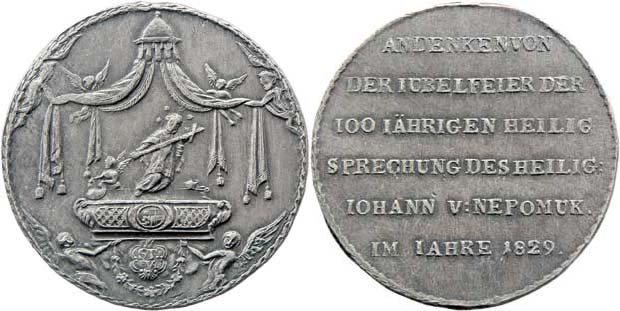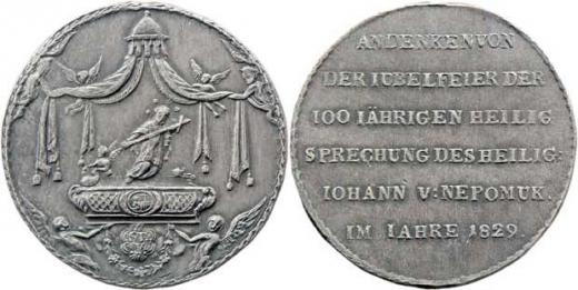 Sarkofág sv. Jana Nepomuckého pod baldachýnem / 6-řádk.německý nápis, 1829, Sign.ST (F.Stuckhart), olovo 40mm, jako Přib.581a, pěkná patina