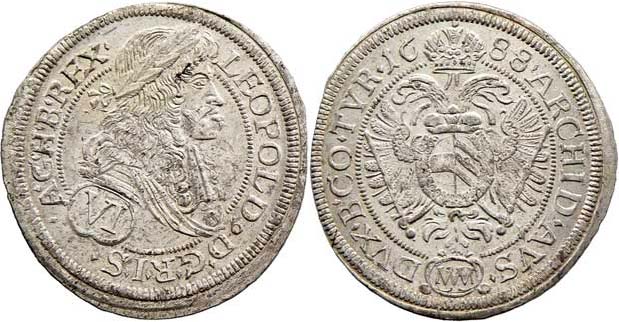 VI Krejcar 1688, Vídeň-Mittermayer, Nech.1947, M-A.187, 3.050g, válcovaný, nep.vady materiálu, pěkná patina, téměř