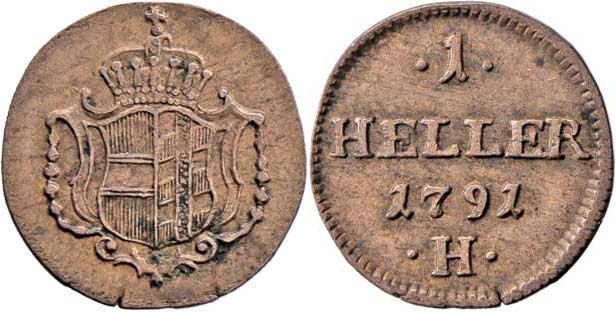 Cu Haléř 1791 H, Günzburg, P.29, M-A.294, 1.066g, nep.vada materiálu na hraně, pěkná patina, téměř R!