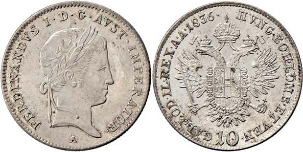 10 Krejcar 1836 A - FERDINANDUS, 3.874g, nep.rysky, pěkná patina R!