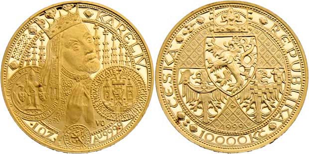10000 Koruna (1 Unce) 1999 - Karel IV., 31.121g, kapsle, etue, karta