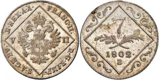 7 Krejcar 1802 B - dobře patrné stopy přeražby, 4.916g, nep.nedor., pěkná patina, téměř