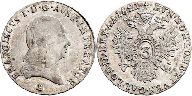 3 Krejcar 1821 B, 1.654g, vlas.rysky, patina, téměř