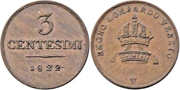 3 Centesimi 1822 V, P.53, 5.322g, nep.rysky, pěkná patina