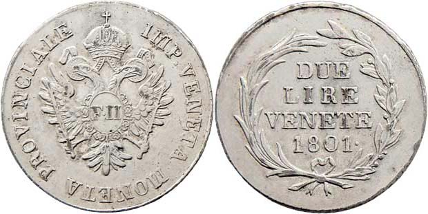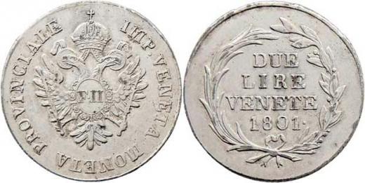 2 Lira 1801 - pro Benátky, P.29, 9.358g, hrany, rysky, stopy po zasazení, patina R!
