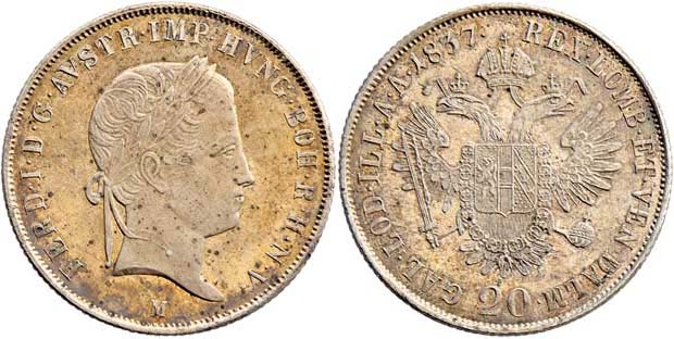 20 Krejcar 1837 M, 6.689g, nep.hr., krásná patina RR!