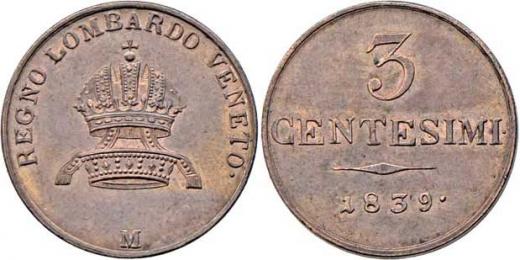3 Centesimi 1839 M, Milán, M-A.326, 5.722g, nep.hr., nep.rysky, pěkná patina R!