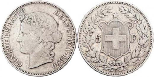 5 Frank 1890 B - hlava Helvetie, KM.34, 24.807g, dr.hr., dr.rysky, pěkná patina R!