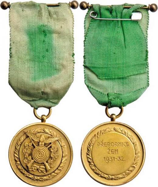 Československá obec střelecká - přebornice žen 1931 - 1932, VM.neuvádí, zlacená bronzová medaile 32 mm s původní vybledlou zelenou stuhou, etue