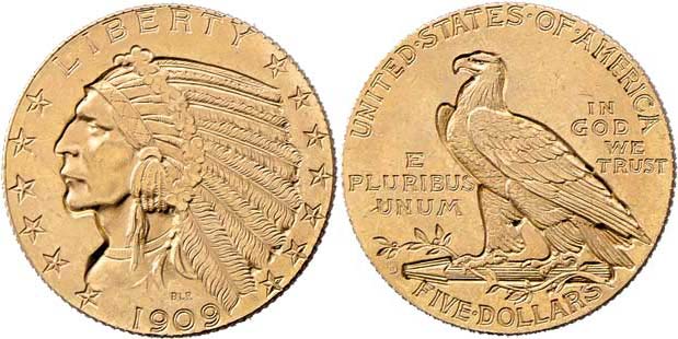 5 Dolar 1909 D - hlava indiána, KM.129, 8.309g, opravená hrana, vlas.rysky