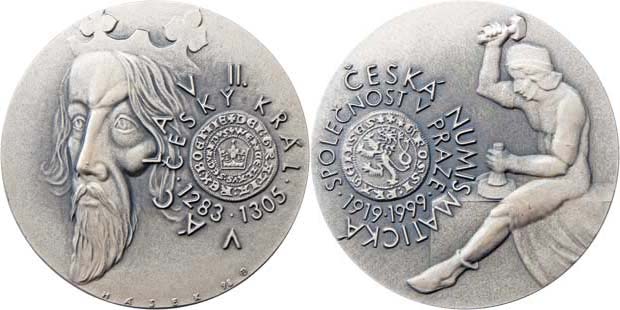 Hásek - 80.výročí založení ČNS 1919/1999 - Václav II. mírně zleva, replika groše, opis / pregéř, replika groše, opisy, Sign., Ag900, 60mm, 103.948g, 100ks RR!