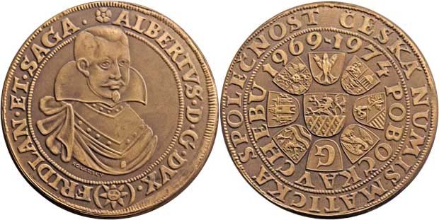 Kolářský - 5 let pobočky 1974 - replika tolaru Albrechta z Valdštejna / znak Chebu a znaky okolních měst, opis, patinovaný bronz 70 mm, BK.1 (70ks) RR!