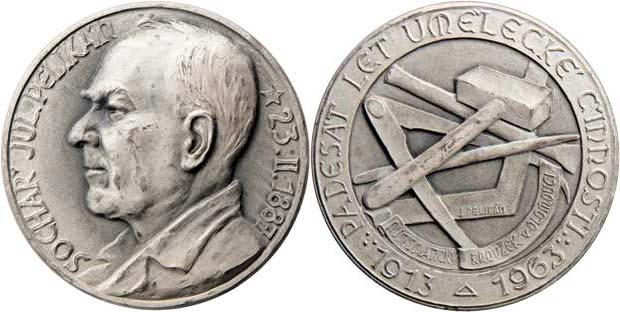 Pelikán - 50 let umělecké činnosti 1963 - autoportrét zleva, opis / sochařské náčiní, písmo, Sign., patin. Ag987, 50mm, 69.449g, BK.13 (17ks) RR!