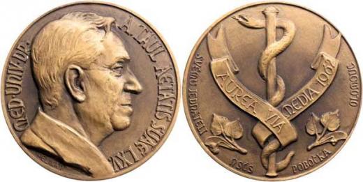 Pelikán - MUDr.Antonín Taul - 65.narozeniny 1970 - poprsí zprava, opis / Aeskulap. hůl, stuha s nápisem, lipové snítky, opis, Sign., pat.bronz 50mm, BK.28/16