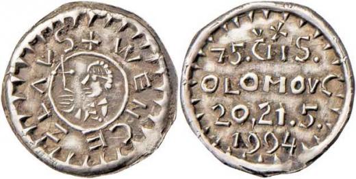 Soušek - oslavy 75.výročí založení ČNS 1994 - 4-řádkový nápis / napodobenina denáru, Nesign., Nepunc., Ag925, 21mm, 2.296g, FM.29B (50ks), pat. RR!