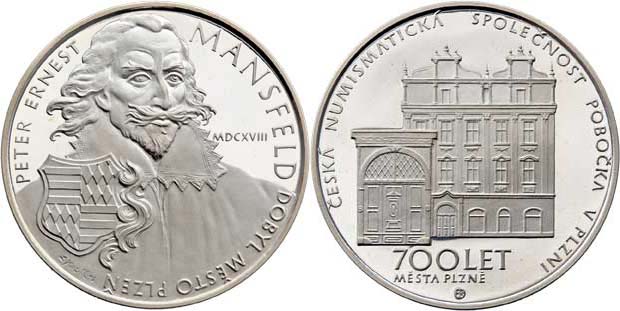 L.Kozák - 700 let Plzně - Peter Ernest Mansfeld 1993 - poprsí zpředu, znak, opis / Gerlachův dům, písmo, Sign., Punc., Ag 900, 40mm, 30.080g, FM.19