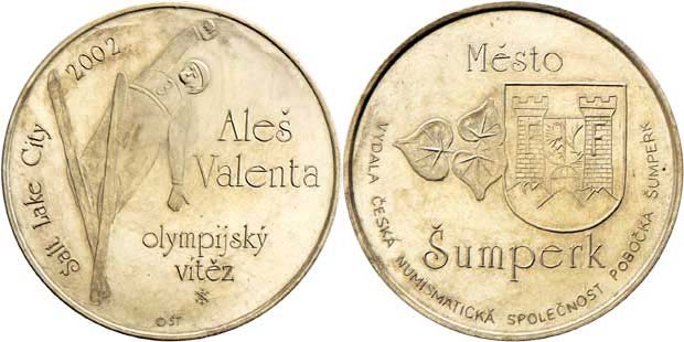 Štětina - olympijský vítěz Aleš Valenta 2002 - lyžař akrobat při skoku, písmo / měst. znak, lipové lístky, písmo, Au585, 40mm, 25.693g, vl.rys.(raženo 5ks) RRR!