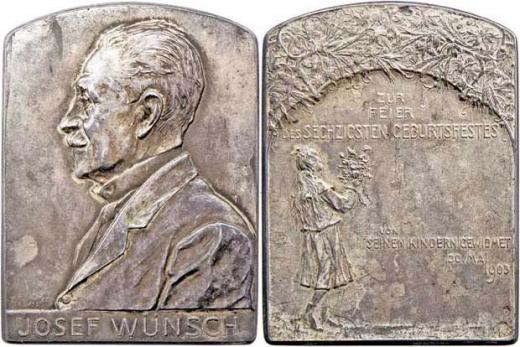 Josef Wünsch - AR plaketa na 60.narozeniny 30.5.1903 - poprsí zleva, nápis / dívka s kyticí, 7-řádkový nápis, girlandy, Sign., 39x52 mm, 47.213g, pat., tém.