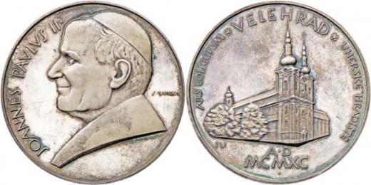 Jan Pavel II. - návštěva na Velehradě 1990 - poprsí zleva, opis / chrám, vročení, opis, Sign., Punc., Ag900, 60mm, 111.439g, patina