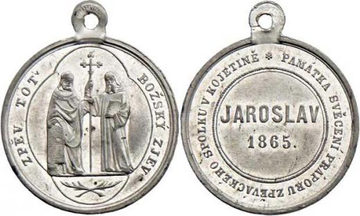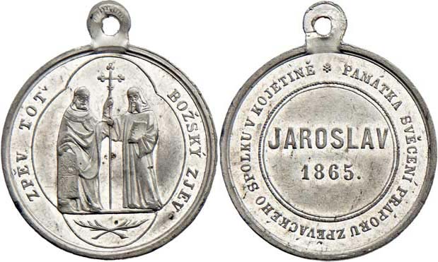 Svěcení praporu zpěváckého spolku Jaroslav 1865 - stojící svatí Cyril a Metoděj, opis / 2-řádkový nápis a opis, Nesign., cín 27 mm s původním ouškem, téměř