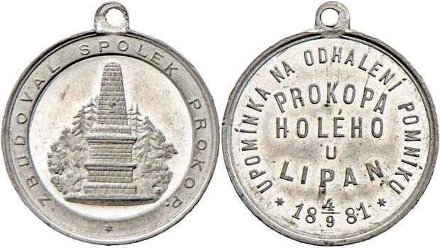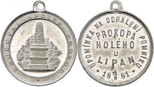 Odhalení pomníku Prokopa Holého 4.9.1881 - pomník a stromy, opis / 6-řádk. nápis, cín 28 mm s původním raženým ouškem, Haus.2327