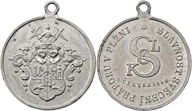 Svěcení praporu Sokola v Plzni 1.VI.1868 - městský znak / emblém, český nápis a opis, Sign.Braun, cín 26 mm s původním raženým ouškem, MZČ.163/1, pat.