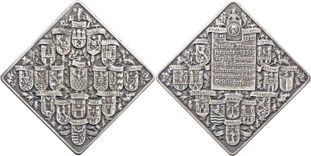 Založení Sudetoněmecké numismatické společnosti 1932- nápis, na Av. i Rv. znaky a jména měst, dubové listy, Nesign., patin. postříbř. bronzová klipa 50x50 mm R!