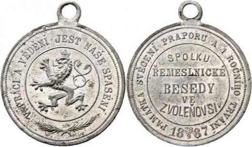Svěcení praporu spolku Řemesnické besedy 28.9.1887 - český lev, ratolesti, opis / 5-řádkový nápis a opis, Nesign., cín 31 mm s původním ouškem, téměř