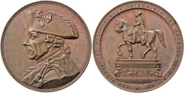 Kullrich - odhalení pomníku Friedricha II. 31.V.1851 - poprsí zleva v klobouku / jezdecká socha zleva na podstavci, opis, Sign., měď 38 mm, krásná patina