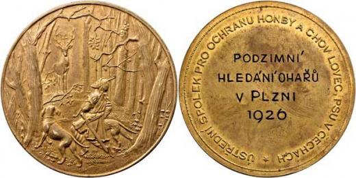 Plzeň 1926 - Podzimní hledání ohařů - vidění svatého Huberta / opis a rytý 4-řádkový nápis, zlacený bronz 47mm, patina, původ.etue firmy Karel Svoboda - Praha