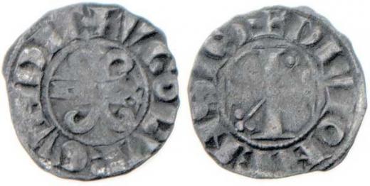 Denár b.l., minc. Dijon, dvě lilie, opis / kříž se dvěma liliemi v úsečích, opis, FW.II.11015-11017, De Wit.I.481, 0.869g, nedor., dr.rysky, tmavá patina