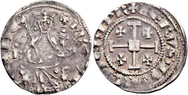 AR Grosso, Trůnící král zpředu, opis, zn."B", tečky / jeruzalémský kříž, opis, podobný jako MI.2440, podob. jako De Wit.III.4009, 4.540g, nedor., pěkná patina R!