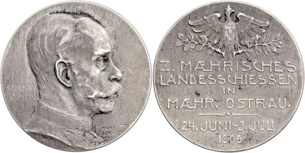 Moravská Ostrava - X.moravské zemské střelby 1906 - hlava zprava, nápis / moravská orlice a 6-řádkový nápis, Sign.Schaefer, patin. Ag800, 30mm, 18.488g