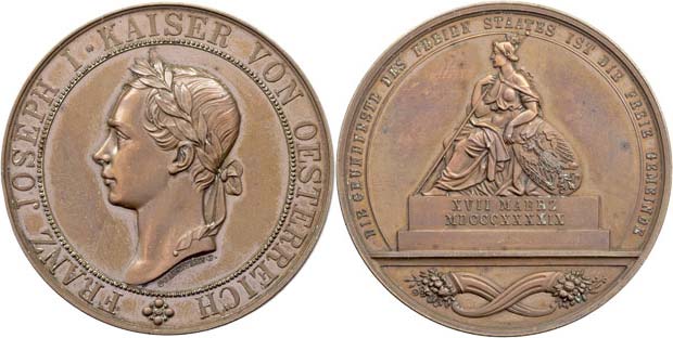 Radnitzky - vyhlášení zákona o místní samosprávě 1949 - hlava zleva, opis / sedící Austria, císařský znak, rohy hojnosti, písmo, Sign., měď 55mm, Haus.794, pat.