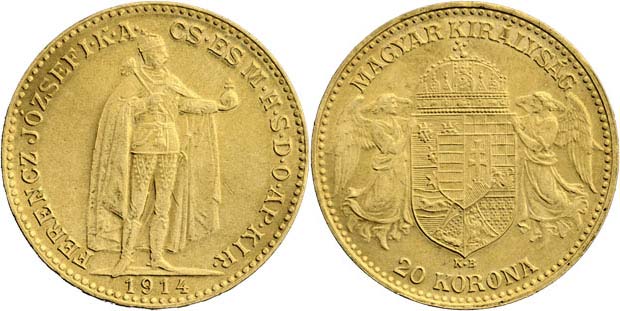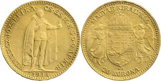 20 Koruna 1914 KB - se znakem Bosny - oficiální hybridní novoražba z roku 1946, Morav.159b (raženo pouze 18.940 ks), 6.764g, nep.hr., nep.rysky, tém. R!
