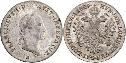 3 Krejcar 1829 A, 1.709g, zcela nep.just., pěkná patina R!