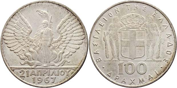 100 Drachma 1967 - revoluce 21.IV., KM.94, 24.998g, nep.hr.