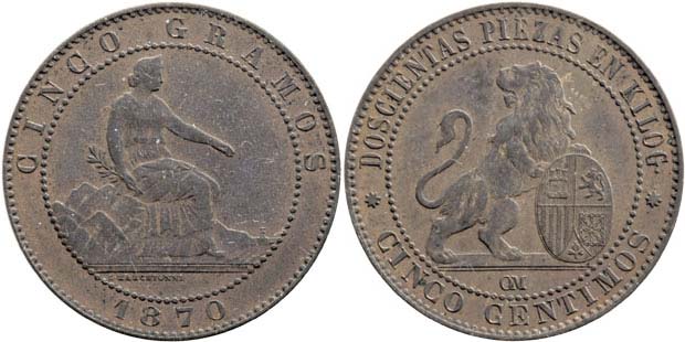 5 Centimos 1870 OM, Madrid, KM.662, 4.990g, krásná patina